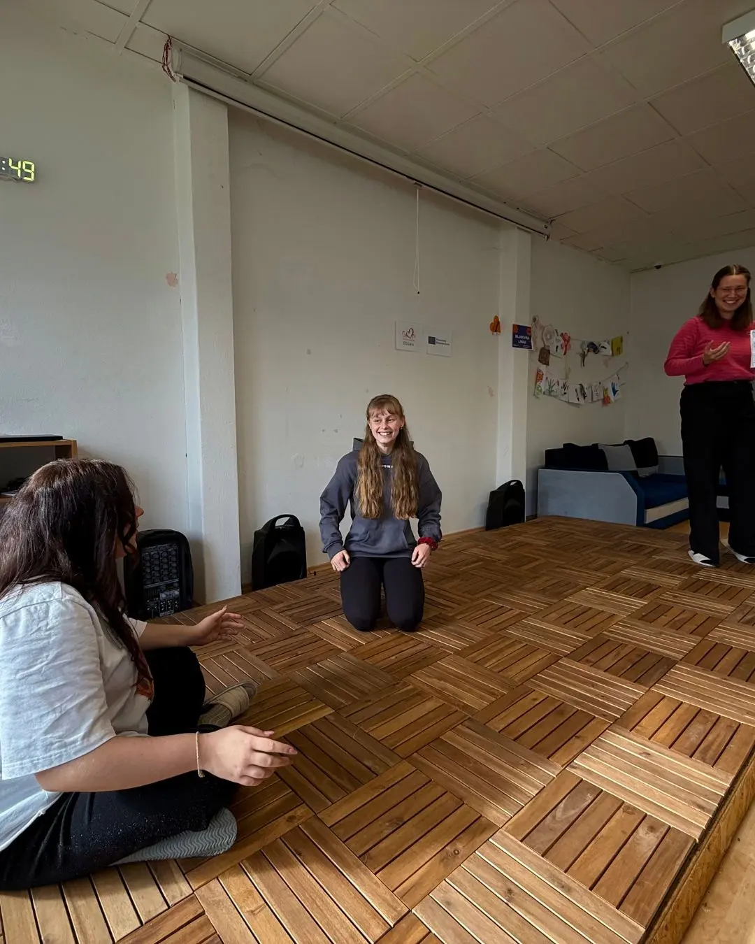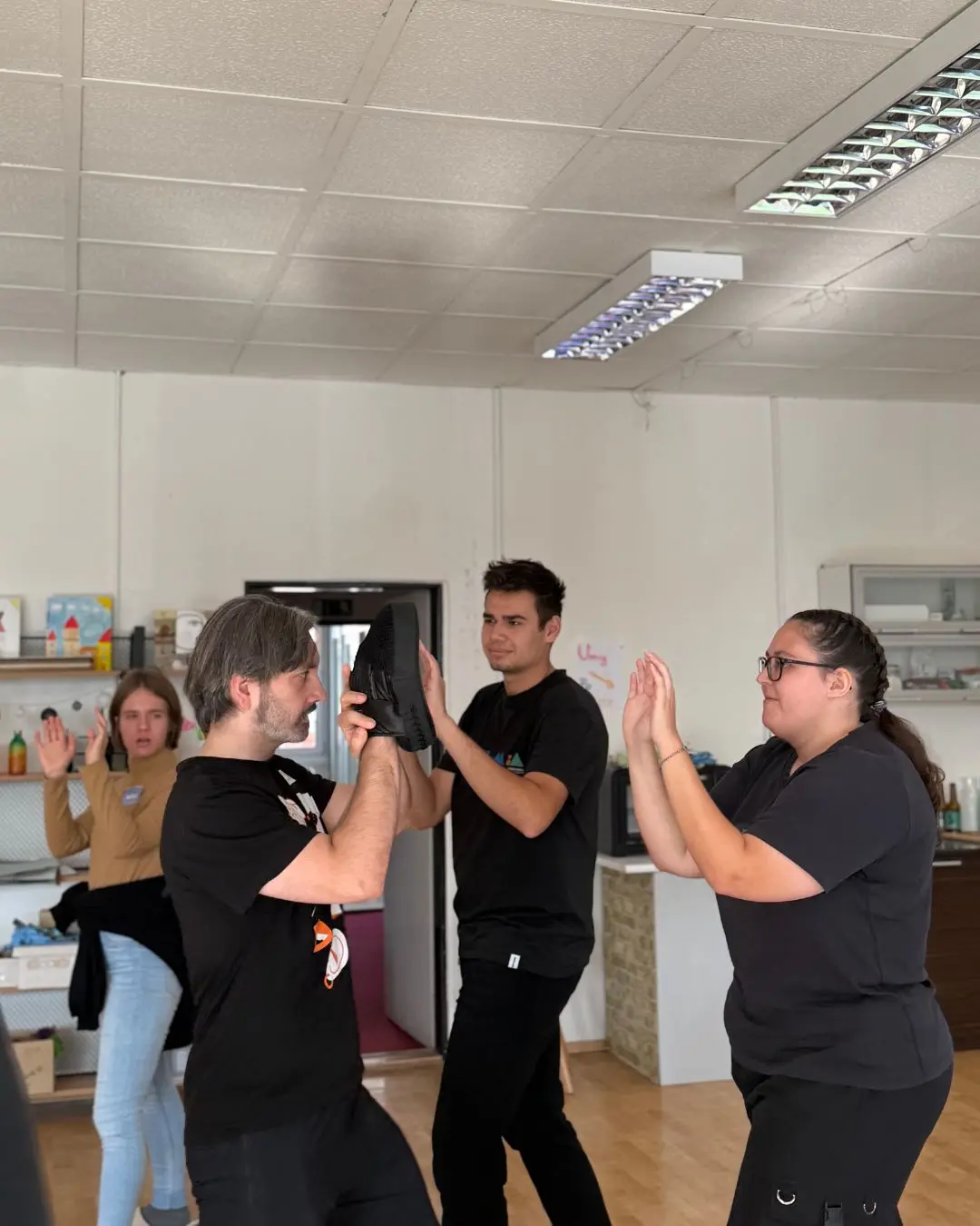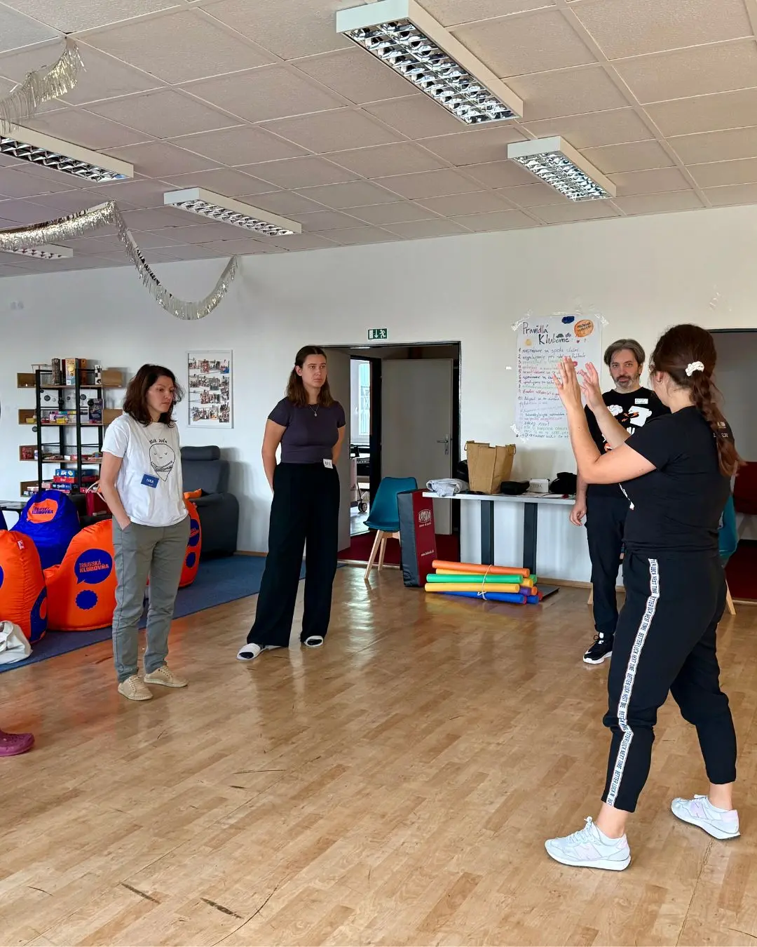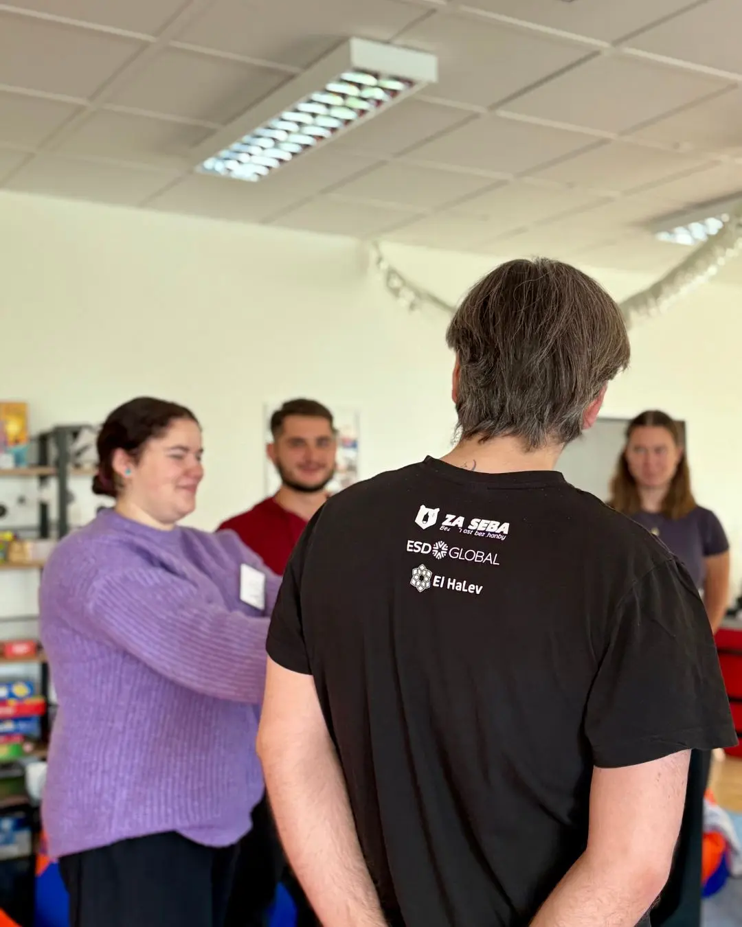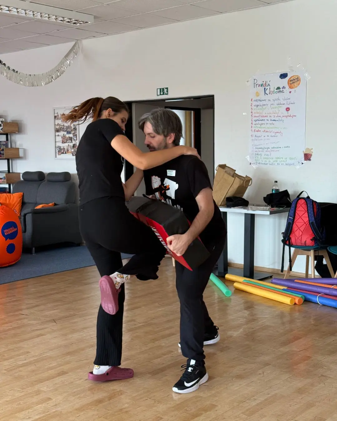 Ďalšia zastávka bola organizácia ZA SEBA, ktorá dlhodobo vzdeláva verejnosť, školy a organizácie v prevencii sexualizovaného, psychického a fyzického násilia. Učia komplexne a to od rozpoznania rizík cez nenásilnú komunikáciu, deeskaláciu a asertivitu až po verbálne, emočné a fyzické techniky sebaobrany. Ich prístup je inkluzívny a dôraz kladú na posilňovanie osobných hraníc a to je presne to, čo v práci s mládežou potrebujeme. Vybrali sme si ich preto, lebo sa nefixujú len na „techniku“, ale najmä na postoj: vedieť povedať „nie“, nastaviť bezpečné hranice a zároveň zostať rešpektujúci. Dôležité je aj to, že hranice nie sú zásadné iba pre nás, dospelých v tíme. Ukazujeme ich aj mladým, že sa môžu a majú vedieť ohradiť v situáciách, ktoré sú im nepríjemné, že je v poriadku povedať „nie“ a nastaviť si svoje hranice. Toto je kultúra bezpečia, ktorú chceme žiť každý deň.